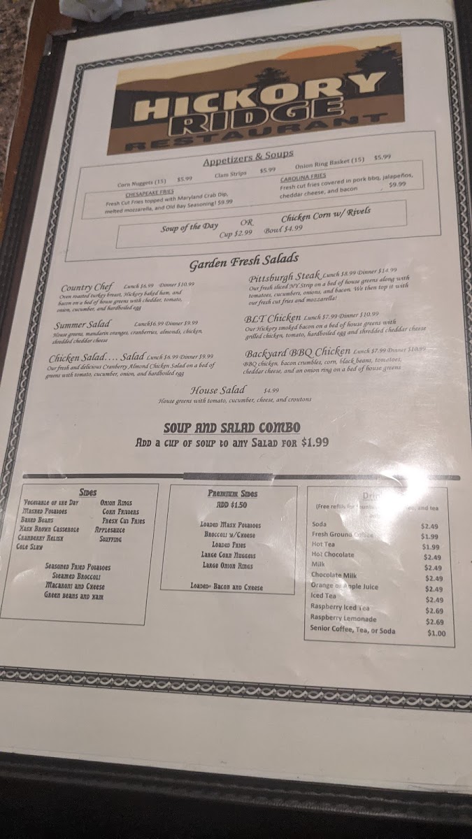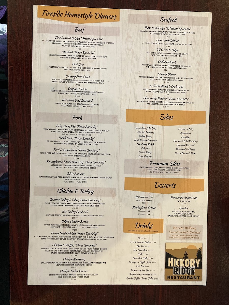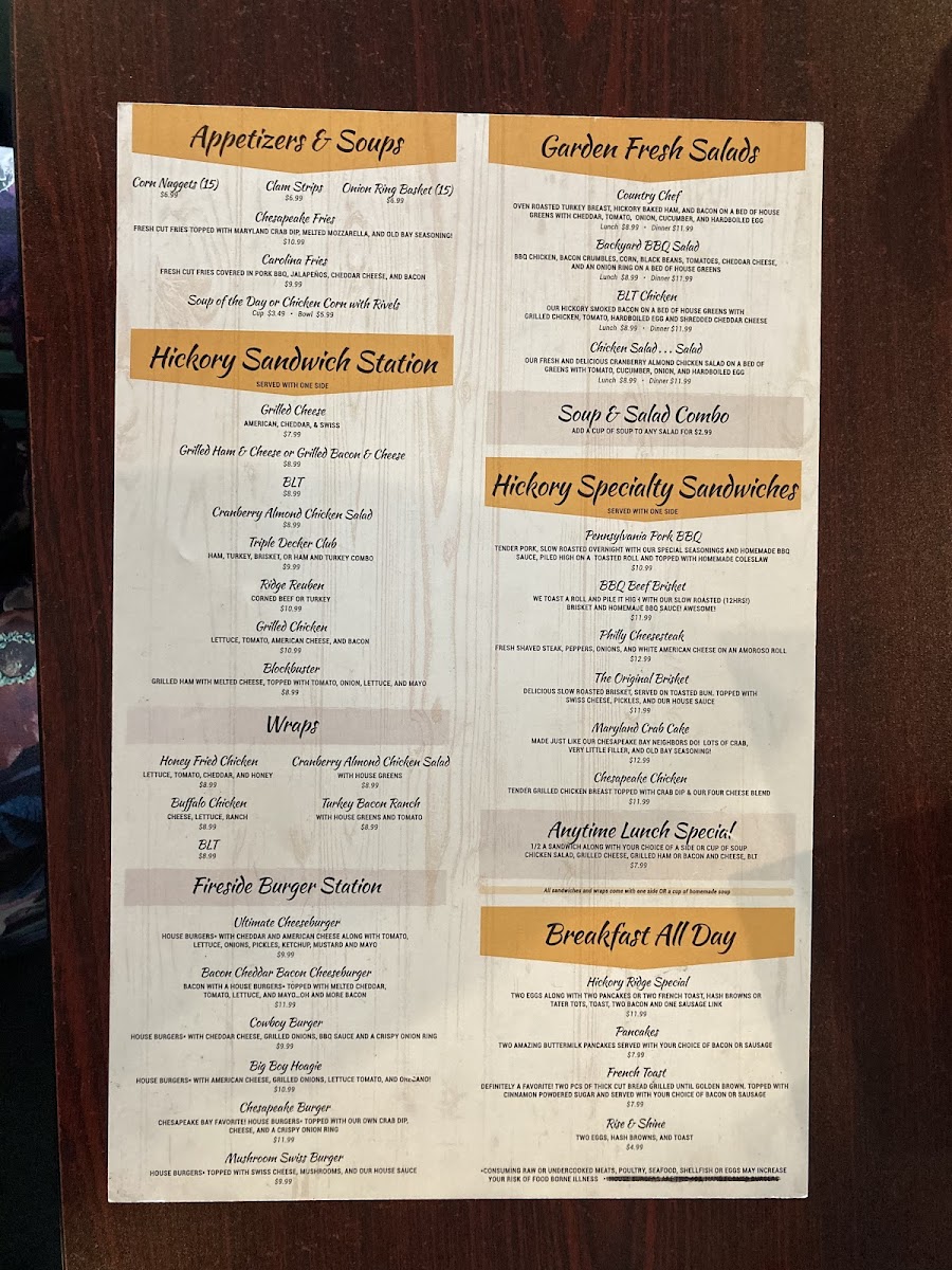 Hickory Ridge Restaurant, located at 3875 Philadelphia Ave in Chambersburg, PA, is a hidden gem for those craving homestyle cuisine. With a menu that highlights comforting classics, guests can indulge in dishes like the Country Fried Chicken and Roasted Turkey with Gravy, each served with a variety of satisfying sides. The Chesapeake Fries, laden with Maryland crab dip and mozzarella, are a must-try for seafood lovers.